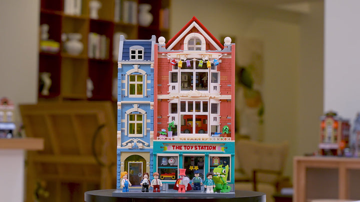 【Lighting Recreates the Town's Cozy Atmosphere】The product features ten light points, predominantly warm white, recreating the bright interior lighting of a toy store. The left side incorporates yellow windows to enhance the warm ambiance.